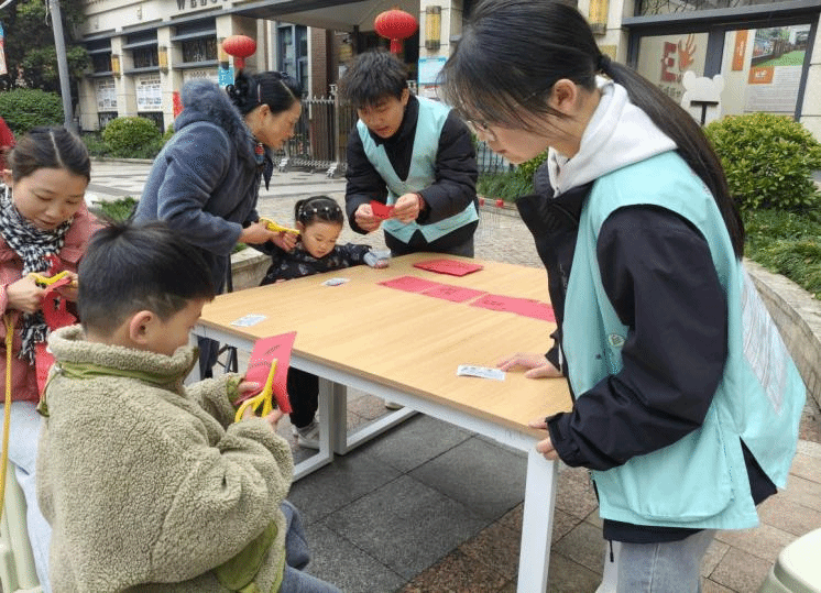 活动伊始,志愿者们提前抵达现场,于场地一隅精心设置签到区域,有序准备物料并引导参与者依次签到,高效完成前期布置与组织工作。活动过程中,志愿者们活跃在社区的各个角落:有人担任“游戏裁判”,认真记录剪纸、投飞镖、乒乓球入桶等项目的得分;有人化身“暖心向导”,耐心引导居民流畅参与游园动线;还有志愿者俯身相伴,手把手带领小朋友学习剪纸技巧,一张张精巧图案在指尖诞生,阵阵欢声笑语也随之荡漾在社区之中。活动尾声,大家一起并肩合影,一张张灿烂的笑脸,不仅定格了温暖的服务瞬间,更凝聚了深厚的邻里情谊,生动诠释了青春力量扎根社区、服务为民的朴素初心。