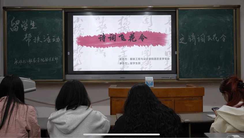 4月23日,服装工程与设计学院在南苑致知楼开展了留学生“手牵手,共进步”系列活动之“寸心寄华夏,年少漾诗华”诗词飞花令活动。此次活动旨在弘扬中华传统文化,展示中华诗词之美,带领同学和留学生们走近古典诗词,感受其无限魅力,促进国际文化的交流融合。