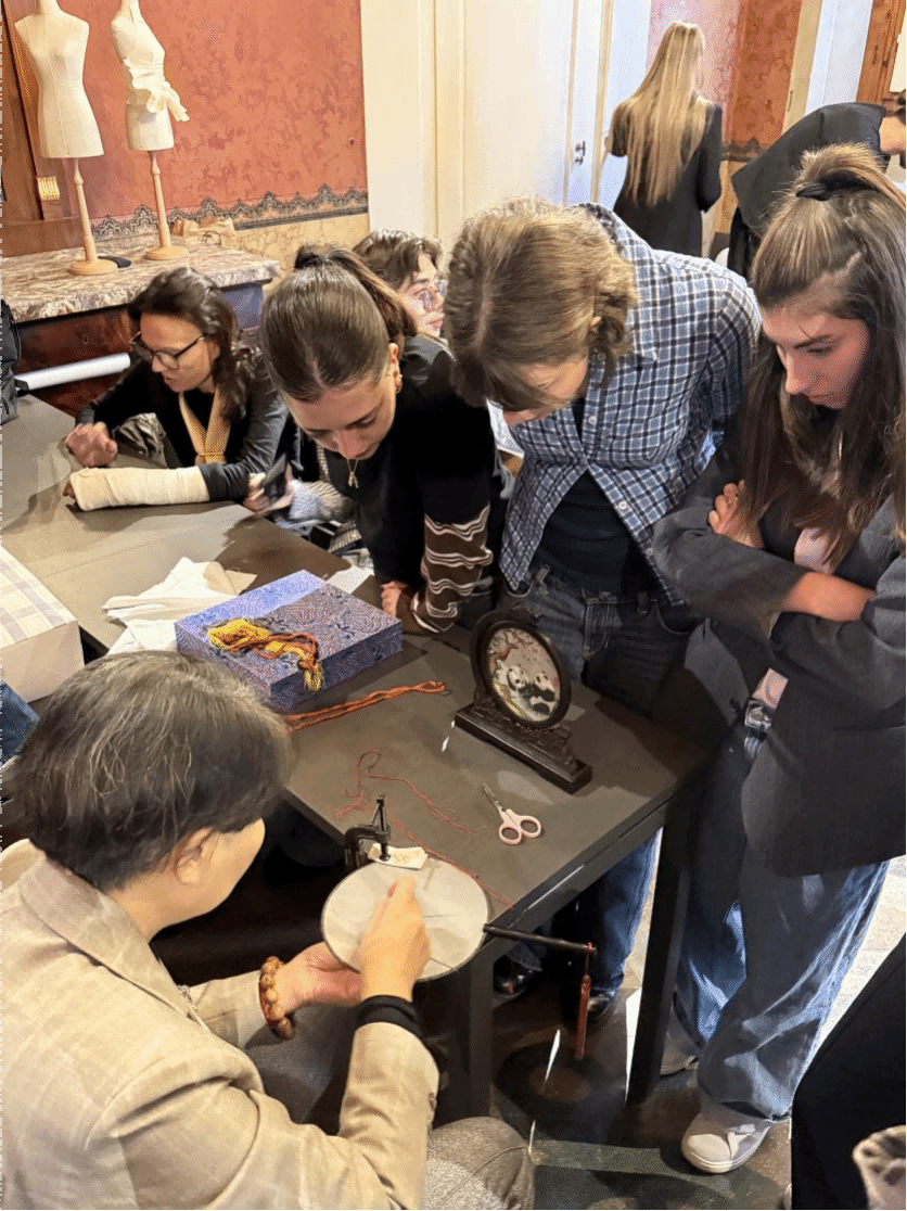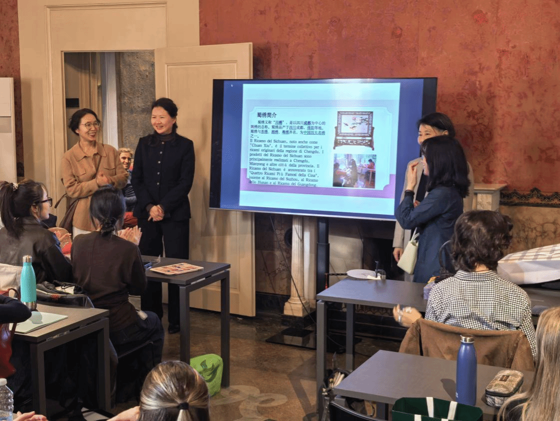 随后,代表团在佛罗伦萨自由美术学院服装学院新校区成功举办蜀绣技艺工作坊培训活动。朱利容教授系统讲解了蜀绣的历史渊源、文化内涵与艺术特色,并现场指导意方师生体验蜀绣技艺。活动反响热烈,意方师生对精美绝伦的蜀绣作品与精湛技艺表达了高度赞赏与浓厚兴趣。