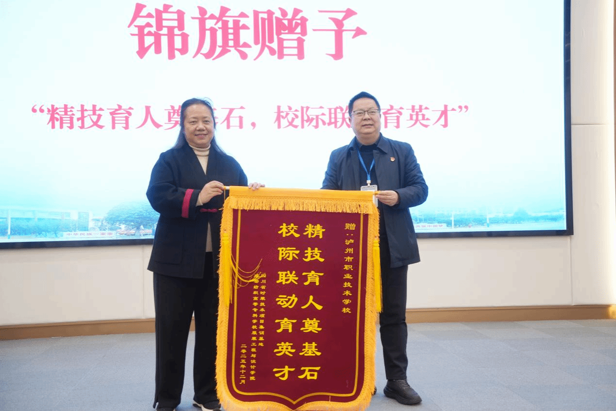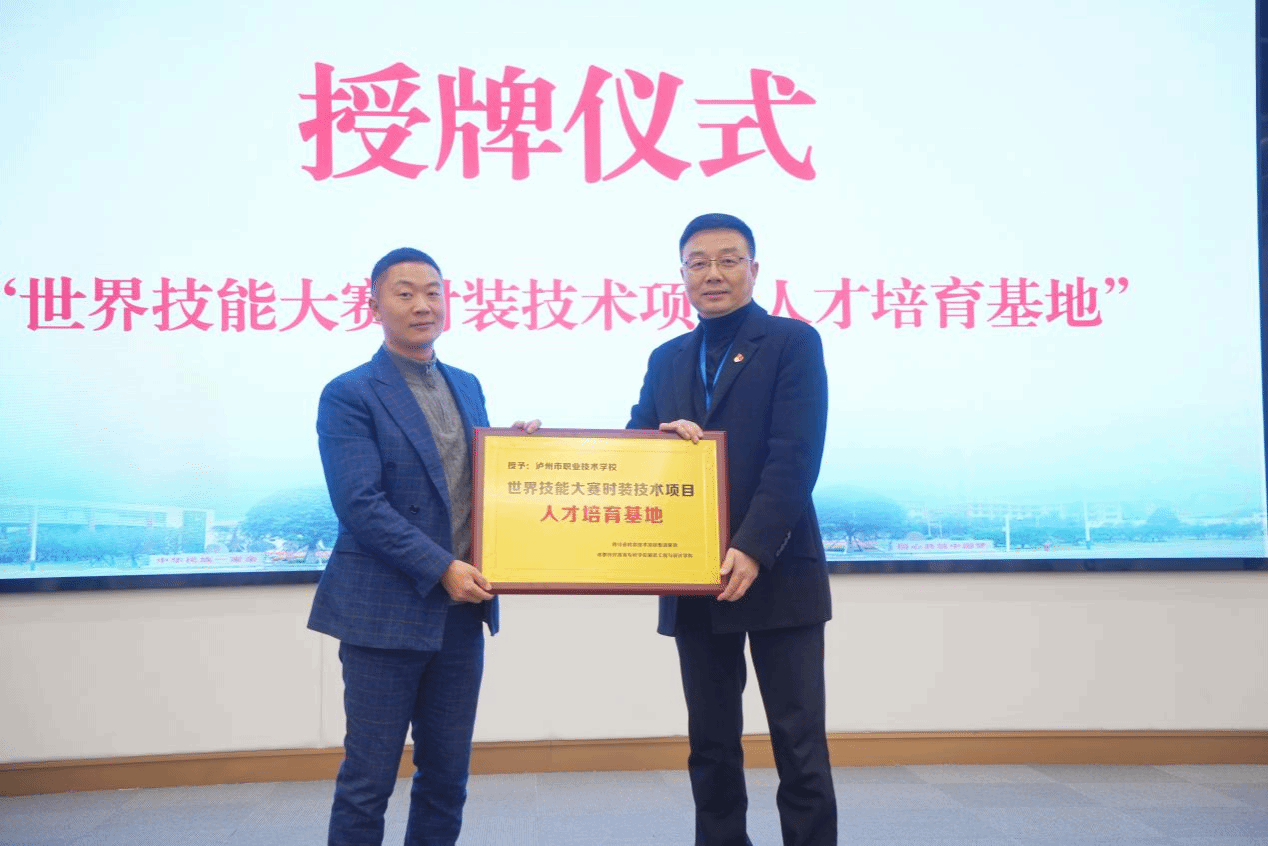 上午10时,仪式迎来高潮。成都纺织高等专科学校服装工程与设计学院院长吴杰与泸州市职业技术学校党委书记林子杰共同为“世界技能大赛时装技术项目人才培育基地揭牌。牌匾的落定,标志着两校在协同培育世赛后备人才方面迈出了实质性步伐。紧接着,四川省时装技术项目集训基地主任阳川向泸州市职业技术学校校长洪波赠予“精技育人奠基石,校际联动育英才”锦旗,这面锦旗既是对两校合作成果的肯定,更是对未来深化协作的期许。