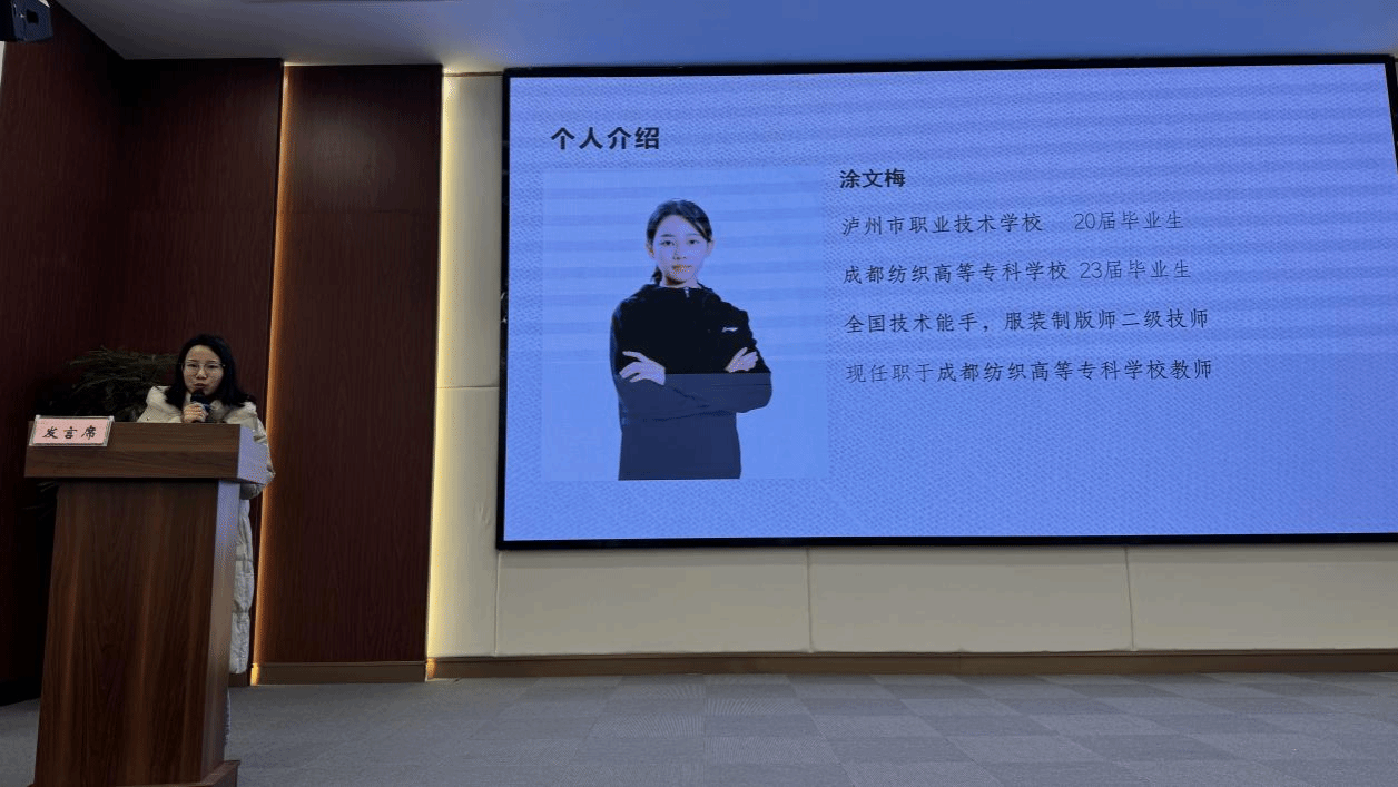 在经验分享环节,优秀毕业生、四川省时装技术项目集训基地教练涂文梅结合自身从职教学子到职业院校教师的成长蜕变,分享了技能成才的宝贵经验与竞赛指导心得。她用朴实的语言、鲜活的案例,诠释了“匠心筑梦、技能立身”的深刻内涵,勉励在场学弟学妹勤学苦练、精益求精,在职业教育的沃土上绽放青春光彩。